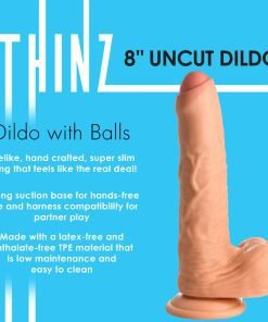 Do you love a man with a long, uncut dong? This dildo celebrates those who have a turtleneck around the head. Hand painted to look excellent up close so you can live out your fantasies without distraction, it is made out of super soft, stretchy and flexible TPE rubber. The skin at the tip folds over the corona of the head, is veiny along the shaft, and slim. At the base are wrinkled balls to bounce on when riding it. Enjoy it hands-free by pressing the super strong suction-cup onto any flat surface. Enjoy the extra length and see how deep you can get it! Invite your partner to play, too! This dong is strapon harness compatible for couples play and pegging. To wash, use warm water and mild soap then rinse and spray with a toy cleaner. Keep out of direct sunlight and away from heat. Use only with water-based lubricants.