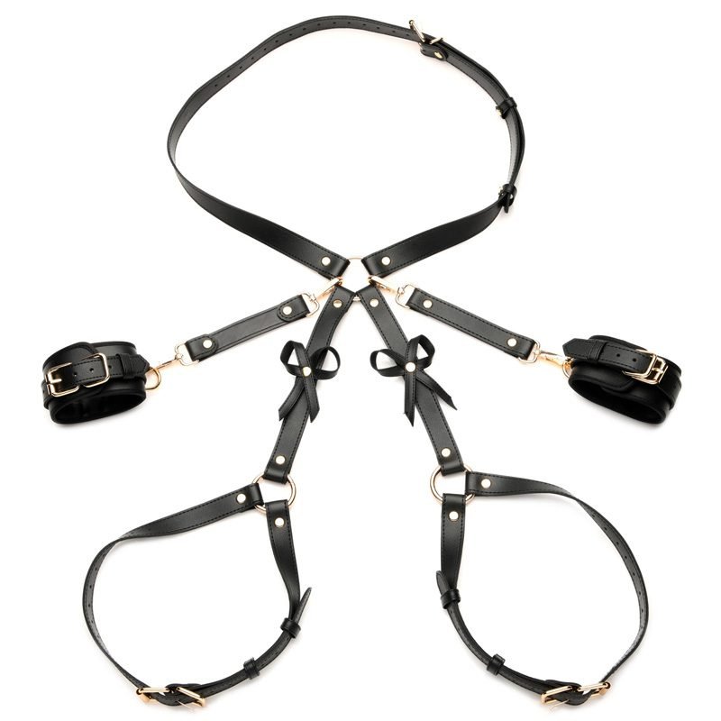 The use of your body is a gift; treat it like one with this bondage harness and wrap up your waist, thighs and wrists like a nice, little package -it even has bows included! Made out of durable PU faux leather, it is vegan friendly and easy to spot clean or wipe clean after each use. The wrist cuffs close using nickel-free, gold colored metal buckles. Adjust the buckles on the thigh straps, waist strap and wrist cuffs for a custom and comfortable fit. Accentuate your curves and make your partner drool with lust and desire as you present yourself as the object of their admiration, a bound and submissive playmate ready to spice up the night!