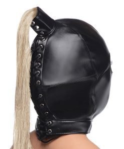 Fulfill your fetish fantasies with this soft leather hood that hides the face while keeping eyes, nose and mouth free! A long blonde wig is attached to the top of the hood for an enchanting effect. This hair can also be used for sensation play the same way you’d use a feather tickler.