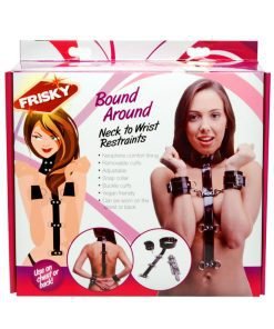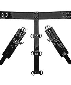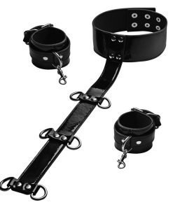Confine your partner is this fully adjustable neck and wrist restraint system! Whether your play thing is wearing this set down their front or back, the removable cuffs can be moved onto any of the three D-rings on each side. Leave your lover trapped and expose as you pleasure them. The neoprene lining is comfortable and durable for long-term use with many repeats! The snap collar is easy to put on and remove quickly, and the buckle cuffs are elegant and will offer no escape! This vegan-friendly system is perfect for beginners and bondage enthusiasts alike!