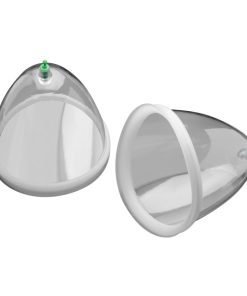 Create temporary engorgement of the breast area with a hand-pumped cupping system! Each of the two large cups has a rubber ring around the base to create a strong seal when you place it on your skin. Attach the green end of the tubing to the green tips of the cups and the white end of the tubing to the hand pump. Pull the pump trigger to create suction, working towards your comfort level. The tubing can be removed and your flesh will stay caught in the pressure of the cup. Press down on the green tip to easily release the suction. Experiment with enlargement and increased sensitivity on your own or with a partner!