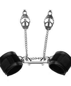 Bind your partner and restrict them in breathless pleasure with this multi-purpose bondage kit. Included are 2 cuffs, a set of clover clamps, and a double sided snap hook. You can use the clamps on nipples, labia, testicles…anywhere you can find a good grip. Once you have chosen the sensitive body part you desire, attach the clamps to the included cuffs. Each movement will tug on the clamps, increasing the pressure and sensation, forcing your sub to stay still or suffer the consequences. All man made materials.