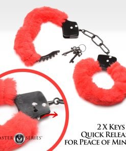 These furry, red cuffs are soft and sensual against your lover’s wrists. The strong, metal cuffs inside won’t cut into their delicate skin. Instead you have the padding of this faux fur, artificial wool! The cuffs are fully adjustable and close as tight as 4.5 inches and open wide to a 7 inch circumference. Included with the cuffs are 2 keys so you always have a spare! To clean, simply spot clean the wool with warm water and soap and a washcloth, then let dry.