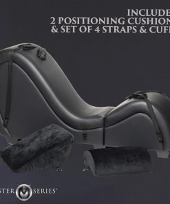 Want your very own sex dungeon at home but don’t have the floor room to spare? This kinky sex chaise longue breaks down into two pieces so you can store it when not in use! Tuck it away in a room, closet, or storage. Break it down to easily transport it from one place to the next! Never stress about fitting that couch through the tight hallway, stairwell or door again! Just unhook the metal brackets and take it a piece at a time! Built out of durable wood and metal, it’s covered with Vegan leather. This faux leather is easy to clean and is smooth and seamless. The couch is comfortable and ergonomically built so you can explore more positions than ever before! Included with the couch are two Love Pillows that act as support aids for your head or chest at the top and allow comfortable sitting or kneeling when placed in the curve of the couch. Restrain your lover to the couch with the soft fleece wrist and ankle cuffs! They each connect via nylon straps to the base of the couch and are easy to adjust and remove. Assembly is easy; simply follow the directions included with the couch. Wash off the couch after a sexy scene with warm water and mild soap. Use a soft cloth to wipe it clean.