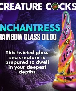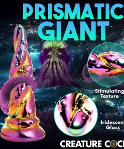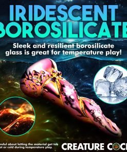 Transform your sex toy collection with phenomenal additions from Creature Cocks! This Kraken dildo has an iridescent, metallic, rainbow of colors featuring bright pink and yellow gold! It is made out of a firm, super smooth borosilicate glass. This kind of glass is the same that you often find in kitchenware and is not only durable and high quality, it also can handle temperature changes so you can enjoy warming it up or cooling it down before insertion! The tip is tapered to make insertion easier and it gradually widens towards the base. Along the shaft are spirals of octopus tentacles with small suckers that add texture to the shaft and stimulate you with each deep plunge within your watery depths! The base is flared so you can combine it with a strapon harness as long as the O-rings are soft. Make sure to use soft O-rings on the firm glass such as silicone or rubber and never use it with metal O-rings! This glass dildo is phthalate-free and body-safe to use with any lubricant type. To wash, use warm water and mild soap then rinse and spray it with a toy cleaner. It is dishwasher safe but exposure to boiling water may result in the color fading.