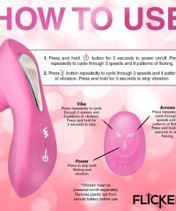 Prepare to reach new heights of ecstasy with this G-Flick G-spot Vibrator! The shaft has a round bulb at the end to increase pleasure and rub you in just the right ways. The flicking arm in the center, however, is what really makes the difference! It lines up to your G-spot and then flicks you with its silicone arm! Enjoy 3 speeds and 9 patterns of flicking! The shaft and base also vibrate, so you can indulge in even more stimulating sensations! Enjoy another 3 speeds and 9 patterns of vibration that you can feel throughout the shaft and along the base as it rubs against your little bud. Control it all with the battery-operated remote from up to 26 feet away! The toy is made out of premium quality, phthalate-free, body-safe silicone. Use it only with water-based lubricants for best results. After playing with it, wash it with warm water and mild soap, then rinse it off and spray it with a toy cleaner. Pat dry and store in a cool, dark place. Recharge using the USB cable provided. Replace remote battery as needed.