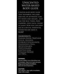 Love the texture and look of cum? Play with our Jizz Body Glide and enjoy using it in sensual play! The creamy white texture is made from a water-based mix and it is unscented so you can enjoy the look and feel without any lingering scents! It is super slippery, so you can slip and slide over each other as you massage each other’s bodies. As a bonus, even if it spills it is non-staining! It stays slick, but because of the water-base it cleans up easily with soap and water. Ingredients included are generally body safe but do include glycerin, so it is not recommended for internal use. Keep away from children and keep at room temperature in an upright position.