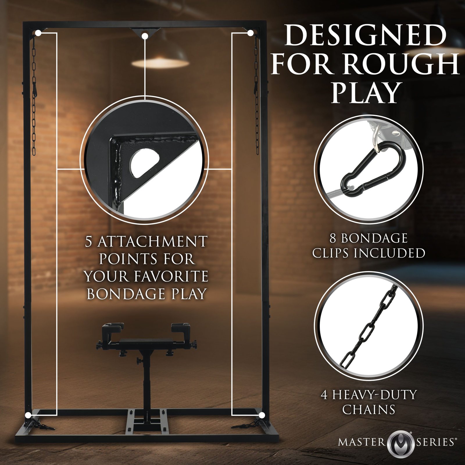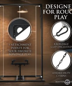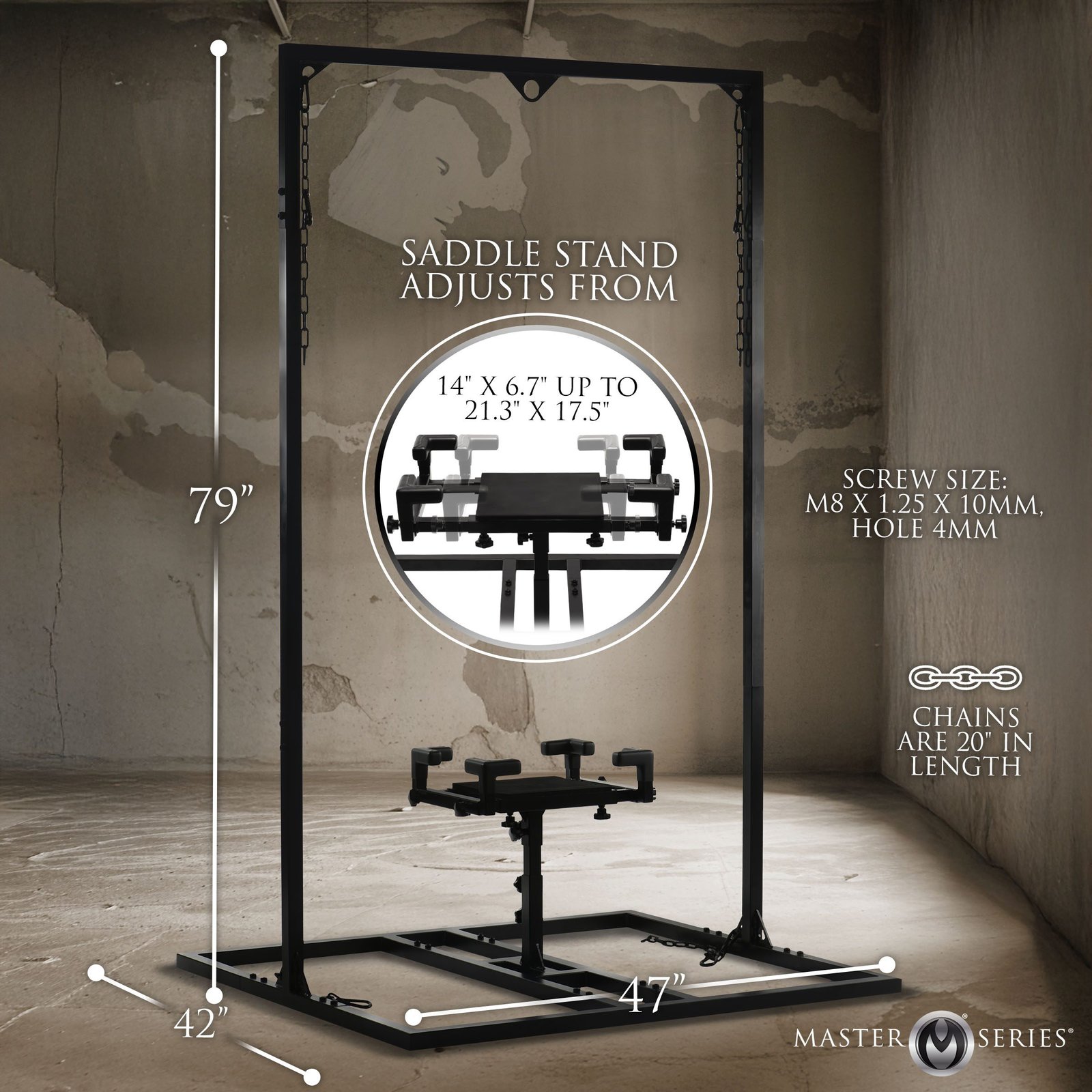 Designed for adventurous users, this sturdy adjustable frame allows standing or elevated positions while using a sex saddle without the need to kneel or bend low. Bring your submissive up to your level and please, punish, tease and tantalize them all while they are restrained by cuffs and chains to the frame! Built with a heavy-duty steel structure, it can handle extremely kinky sessions while offering maximum stability. Featuring 5 attachment points for wrist and ankle cuffs, along with chains and clips included, it’s perfect for fully customizable setups that give you the freedom to dominate the way you want. Lock the sex saddle in place, have them get on top, then restrain them so they can’t wriggle free! They will ha to submit completely to intense, erotic scenes while you use other toys, BDSM gear, or kinky tools on them as they recieve uninterrupted pleasure. Compatible with nearly all saddle machines, this is a must-have upgrade for enhanced functionality and long-lasting use.