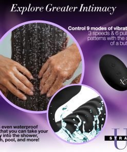 With a push of the button on the remote control, send vibration into the slender shaft and the textured bulb of this double-sided dildo. This rechargeable pleasure tool features dual motors to provide you with 3 speeds and 6 patterns of powerful internal thrumming for both partners. The single control button on the Pro Rider is easy-to-use and accessible during penetration, but a remote control makes it even more convenient and exciting! The silicone remote fits easily and securely in your hand while you immerse yourself in intimacy, granting access to all 9 functions. Both ends of this artfully designed double dong are shaped for the ultimate in ecstasy: the bulb is adorned with gentle waves while you grind your clit against bold grooves of the front pad. Meanwhile your partner will be treated to a narrow, comfortable shaft with a slight ridge. It is even waterproof so that you can take your play into the shower, bath, pool, and more! Explore greater intimacy with a vibrating double-ended strapon dildo. Made of silky silicone, the Slim Rider is non-porous and phthalate-free. Clean with warm water and mild soap or toy cleaner and avoid use with silicone lubricants.