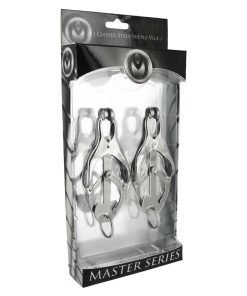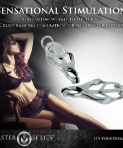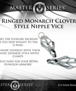 A comely device of restriction and paradise. The Ringed Monarch is an effective training tool in the art of endurance and sensation play. These devious chrome clover-style clamps are ideal for solo play or with the one you want to dominate. When the O-ring is pulled, the clamps pressure becomes more intense. Use your imagination, this devious set includes a convenient O-ring that can be weighted, laced, and more. In your domain: you decide.