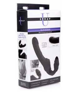 A slender shaft, subtle textures, and 9 incredible modes of vibration set this beautiful strapless strap-on apart! This rechargeable pleasure tool features dual motors to provide you with 3 speeds and 6 patterns of powerful internal thrumming. The single control button is easy-to-use and accessible during penetration. Both ends of this artfully designed double dildo are shaped for the ultimate in ecstasy: the bulb is adorned with gentle waves while you grind your clit against bold grooves of the front pad. Meanwhile your partner will be treated to a narrow, comfortable shaft with a slight ridge. It is even waterproof so that you can take your play into the shower, bath, pool, and more! Explore greater intimacy with a vibrating double-ended strapon dildo. Made of silky silicone, the Slim Rider is non-porous and phthalate-free. Clean with mild soap and warm water and avoid use with silicone lubricants.