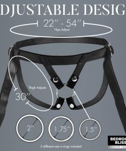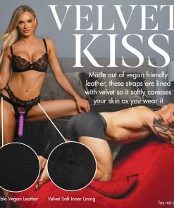 Simple, elegant and comfortable. This Velvet Kiss strapon harness wraps around your hips and thighs perfectly while the velvet inner lining softly caresses your skin with each movement. The straps are all adjustable; simply tighten or loosen them using the D-rings. At the front is the O-ring snapped into place and held securely during play! Choose between 3 different O-ring sizes as you explore small, medium and large sizes of dildos. All metal is nickel-free and the sleek looking leather is made out of vegan friendly material. The open back lets you give as good as you get by leaving access to your derriere! The straps wrap around your thighs so you can still receive pleasure from your partner in between passionate penetration.